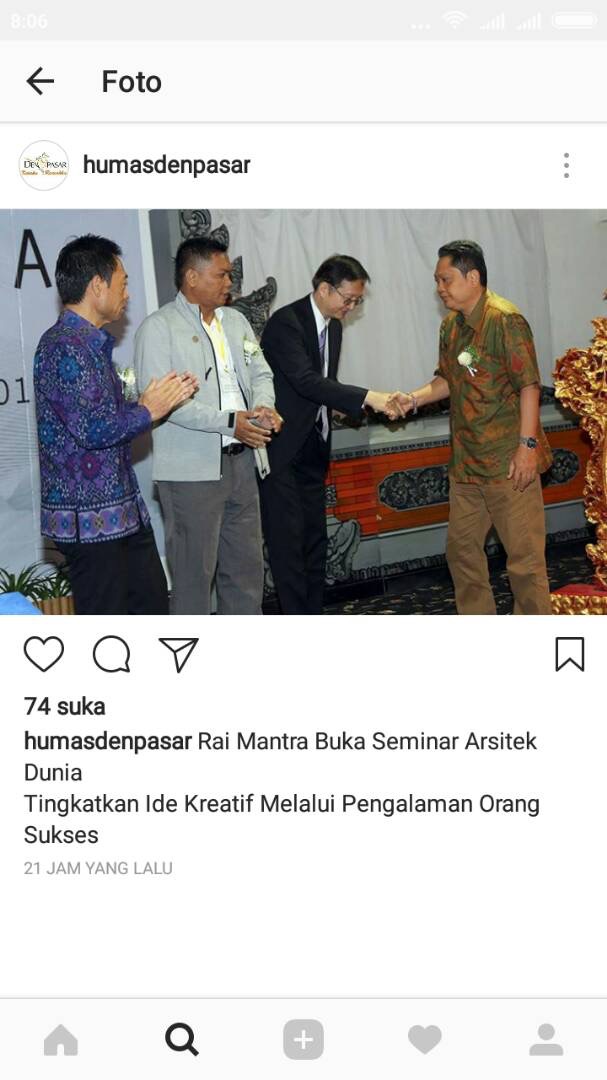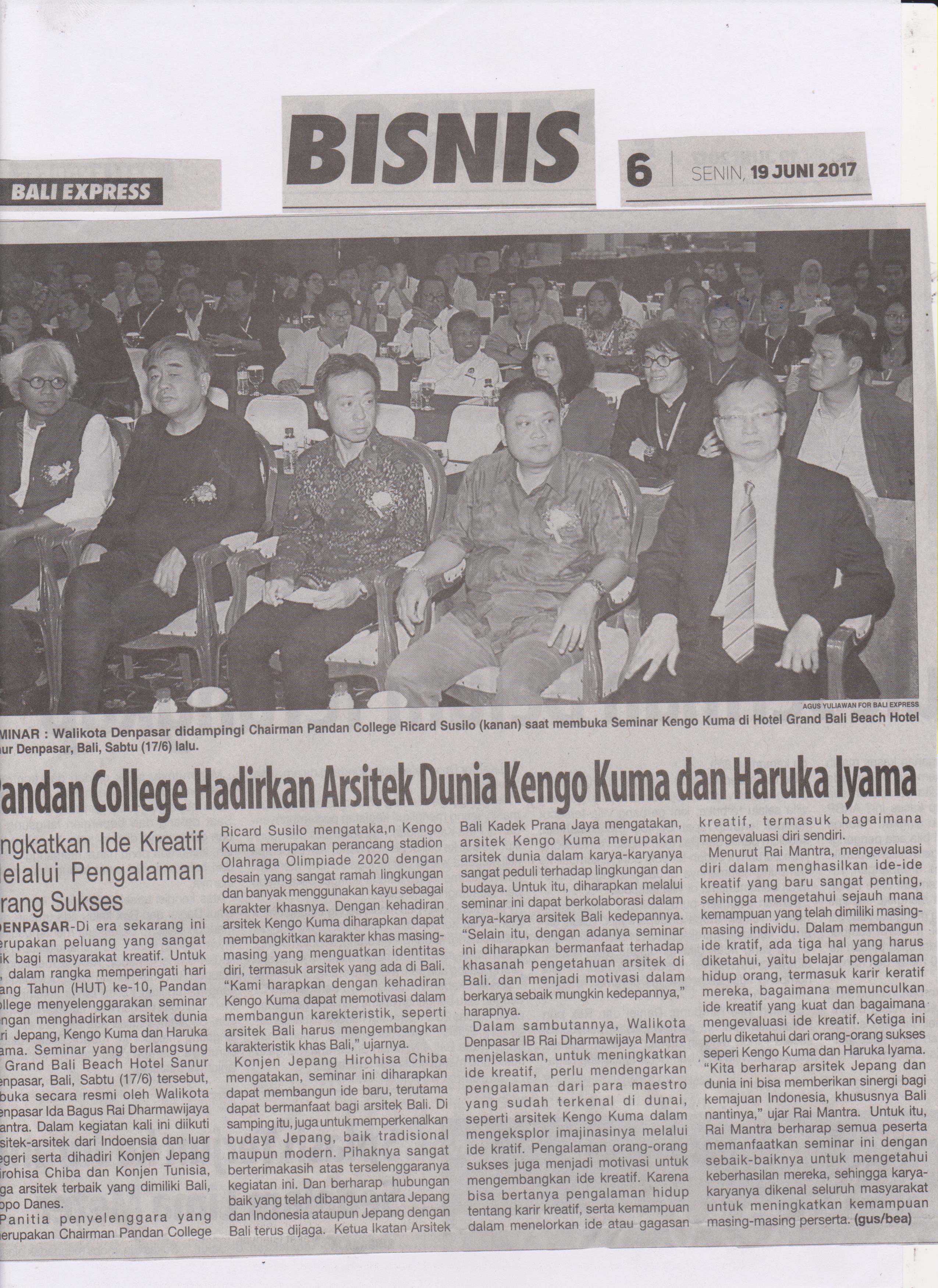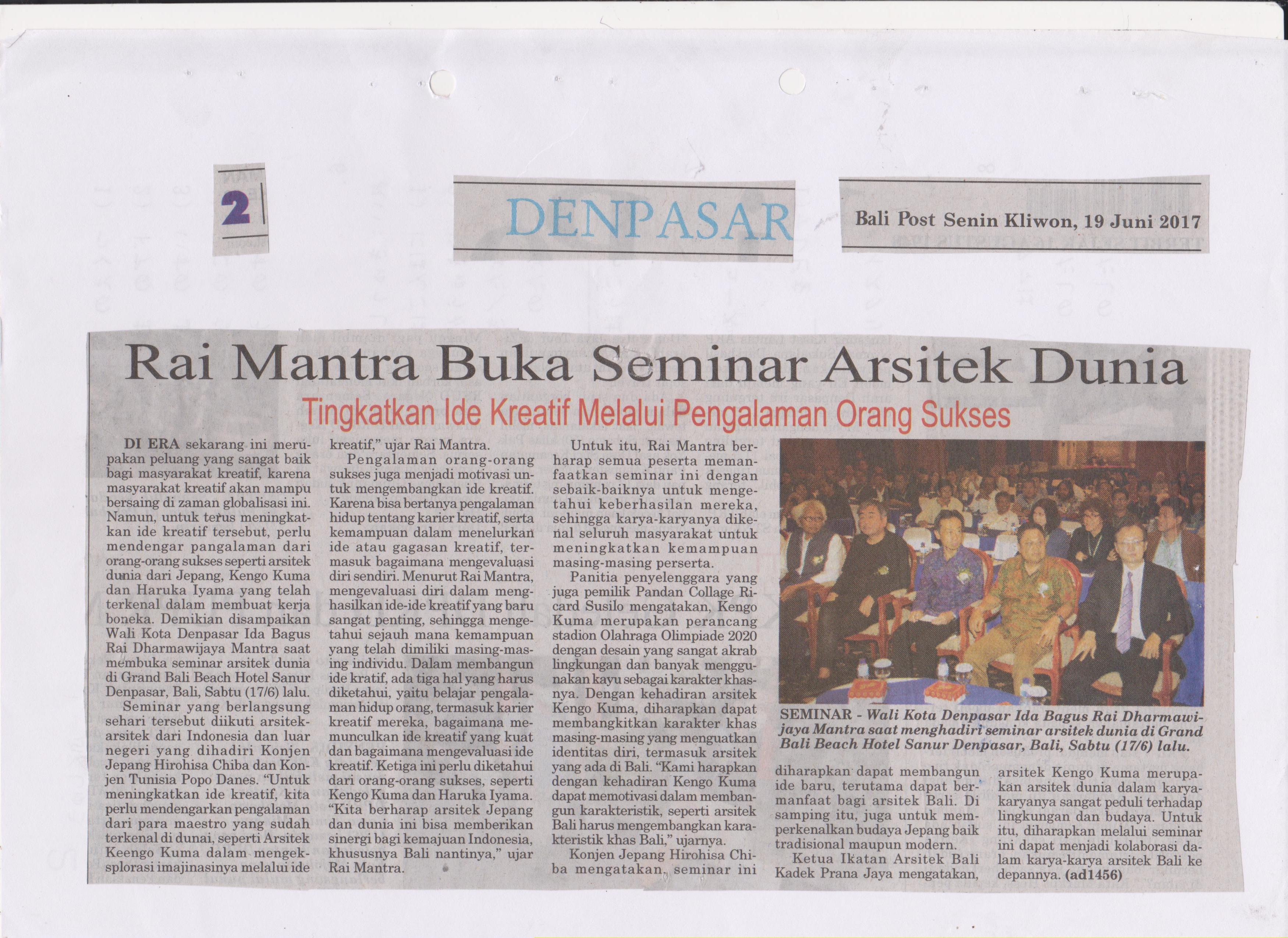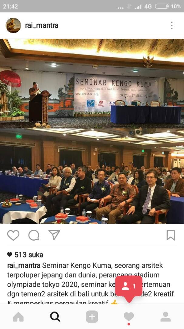 Seminar Kengo Kuma diselenggarakan di Denpasar, Bali, Indonesia, tanggal 17 Juni 2017 dengan dukungan serta kerjasama dari Ikatan Arsitek Indonesia (IAI) Bali. Pendaftaran dapat dilakukan lewat situs ini: www.jepang.com/arsitek/
